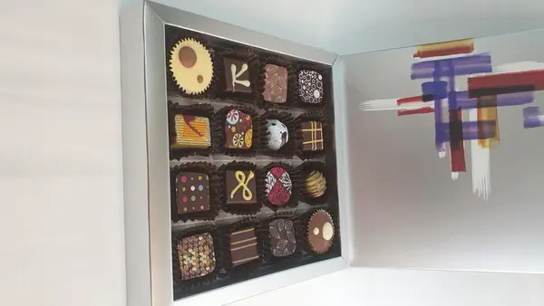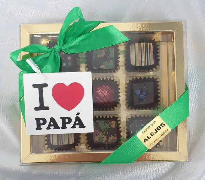 Caja bombones surtidos 16 und. Elaborados con coberturas de origen. Sabores: rosa, violeta, hierbabuena, limon, naranja, romero, vainilla, cafe, nuez moscada, jengibre,piña colada,melocotón, etc.. Elaboracion propia-